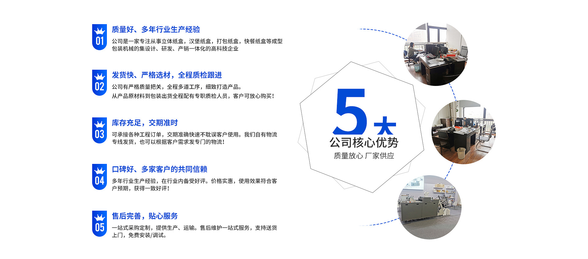 瑞安市中法機(jī)械有限公司是一家從事立體紙盒機(jī),漢堡紙盒機(jī),打包紙盒機(jī),快餐紙盒機(jī)等成型包裝機(jī)械的設(shè)計(jì)、研發(fā)、產(chǎn)銷一體化的高科技企業(yè)。公司有現(xiàn)代化的管理體系和完善的售后服務(wù)體系;有一支具有充滿青春活力的精銳研發(fā)團(tuán)隊(duì)!自成立以來,中法公司堅(jiān)守“誠信、學(xué)習(xí)、發(fā)展”的企業(yè)發(fā)展理念,堅(jiān)持“以誠信為道、以質(zhì)優(yōu)取勝”的經(jīng)營原則,在市場(chǎng)競(jìng)爭(zhēng)中取得了良好的社會(huì)和經(jīng)濟(jì)效益!